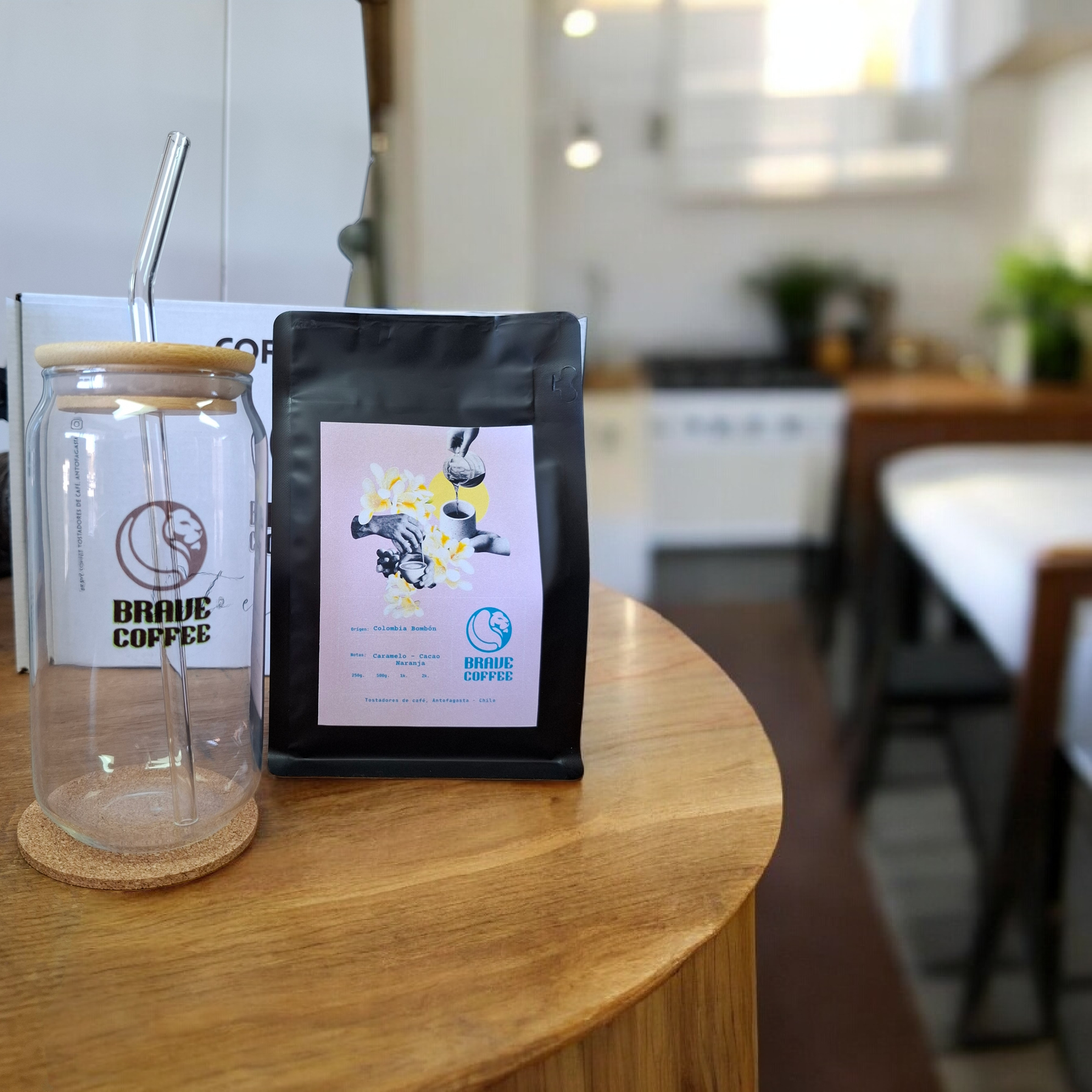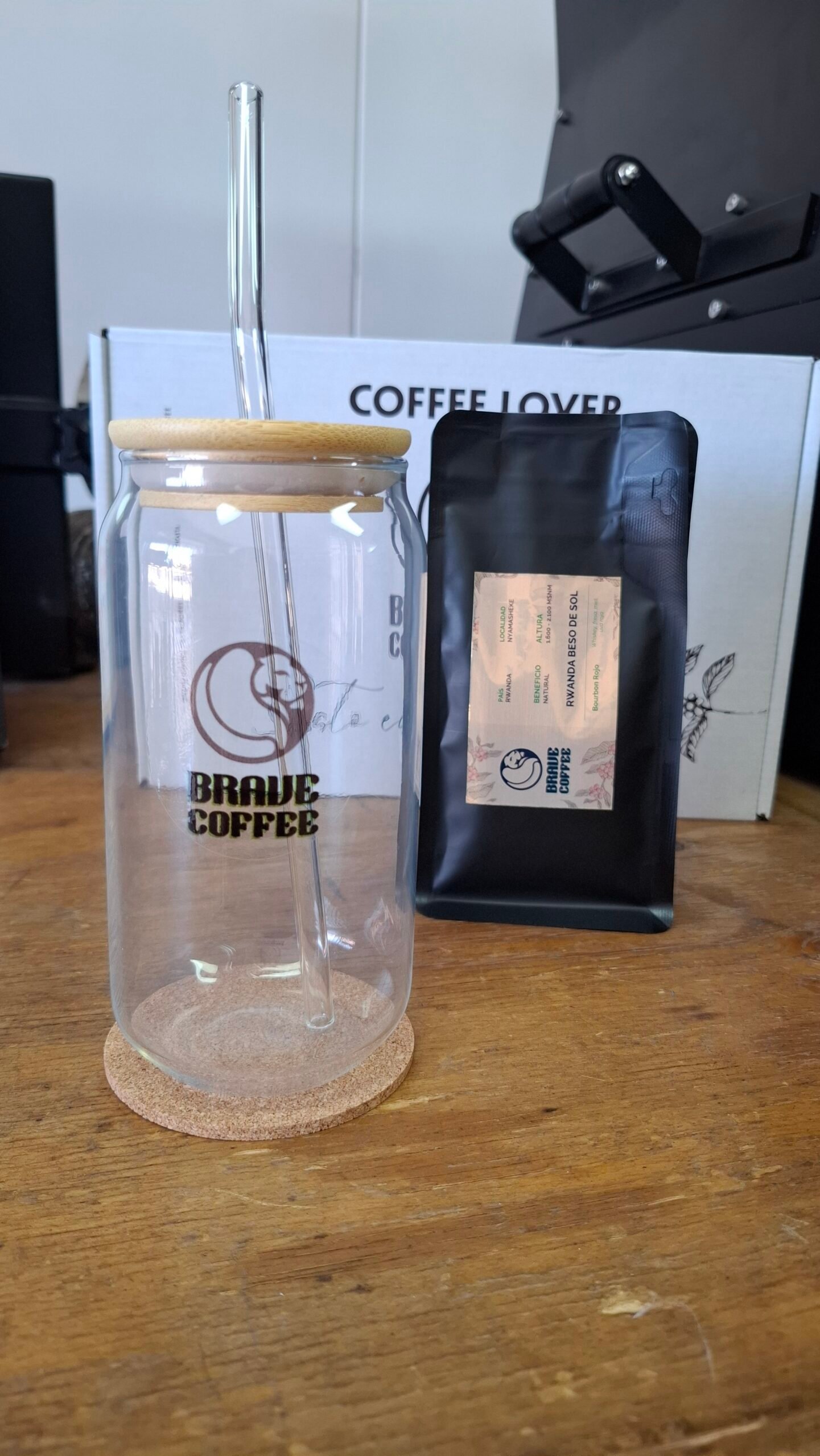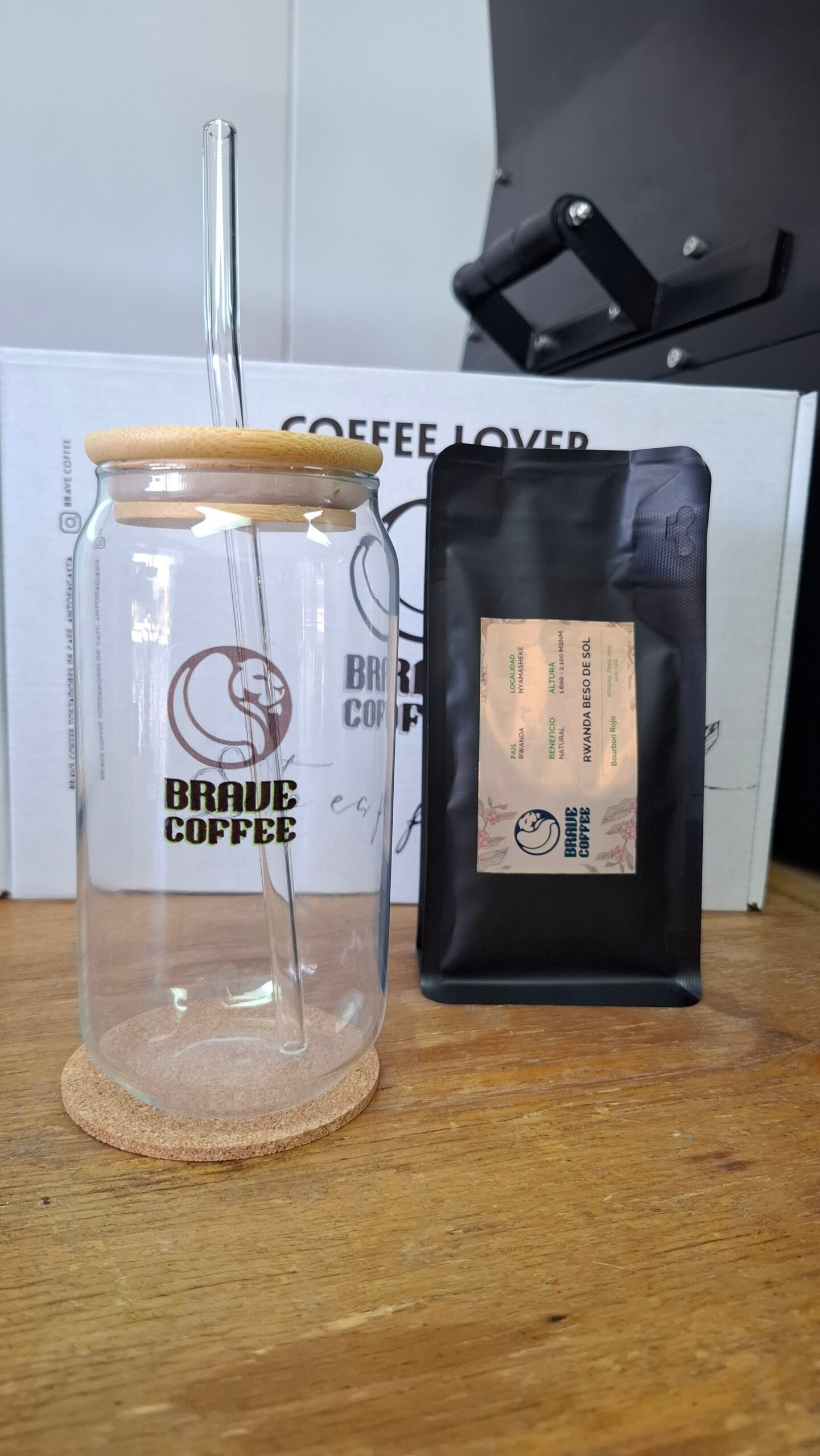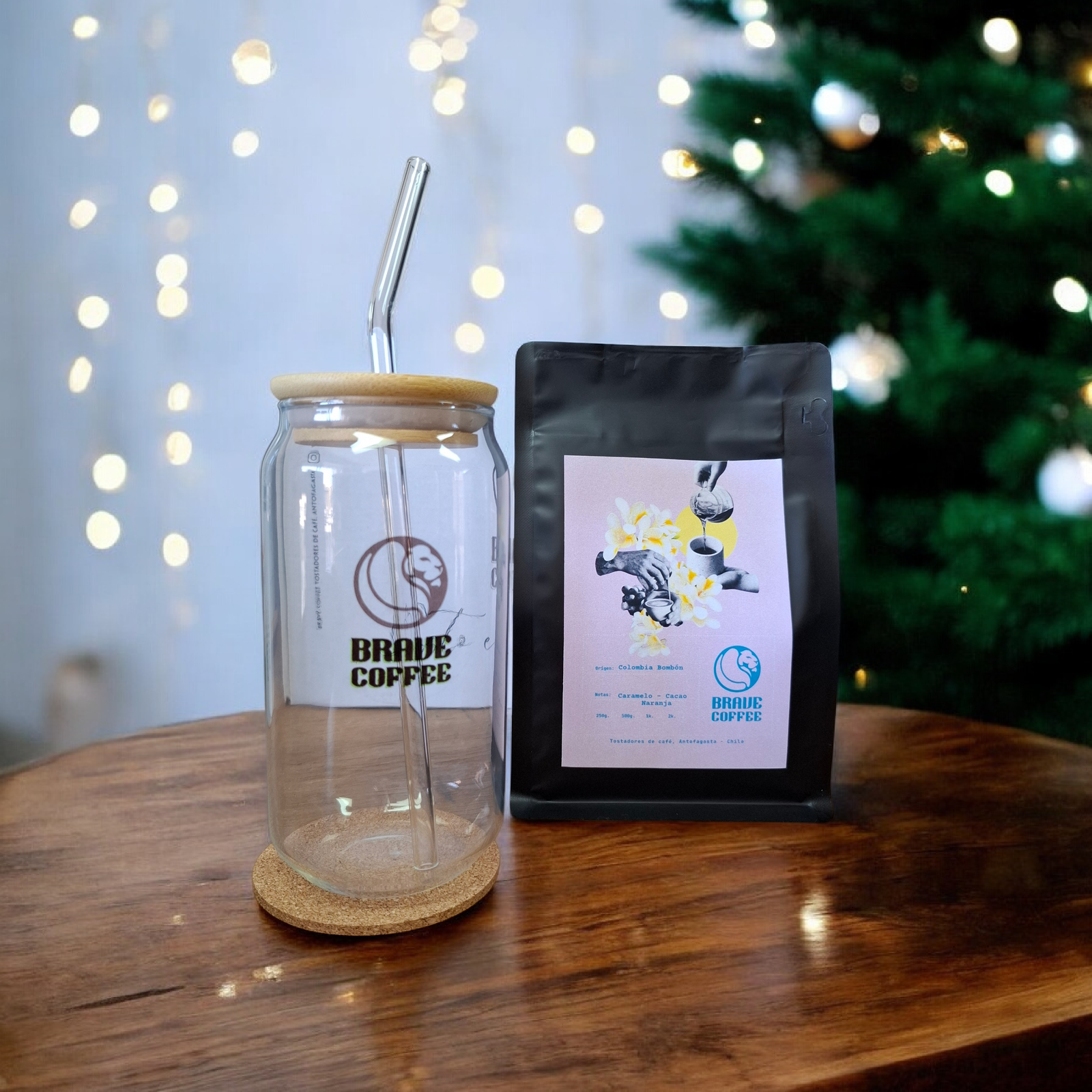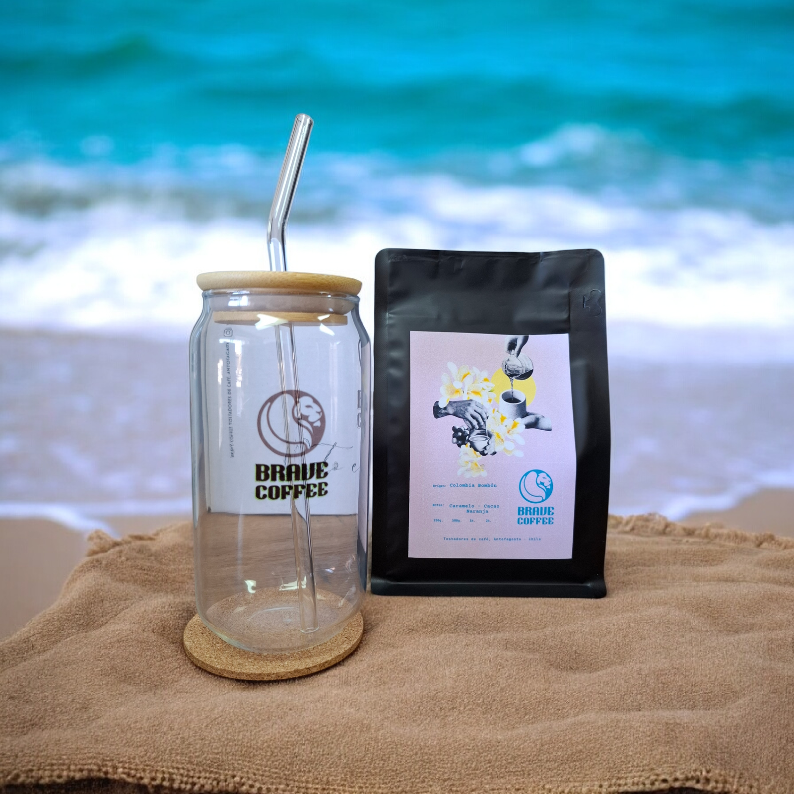Vaso «Toma todo» de vidrio 500 cc, incluye bombilla. limpiador y posavasos.